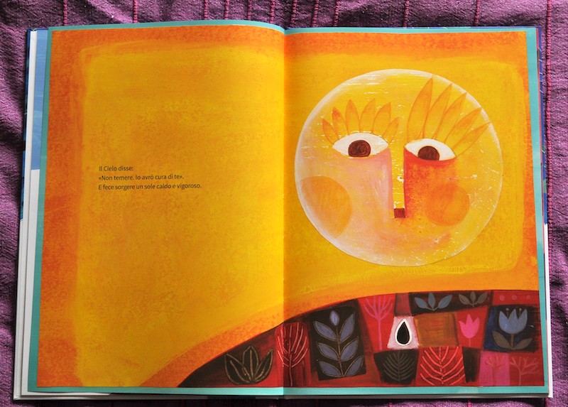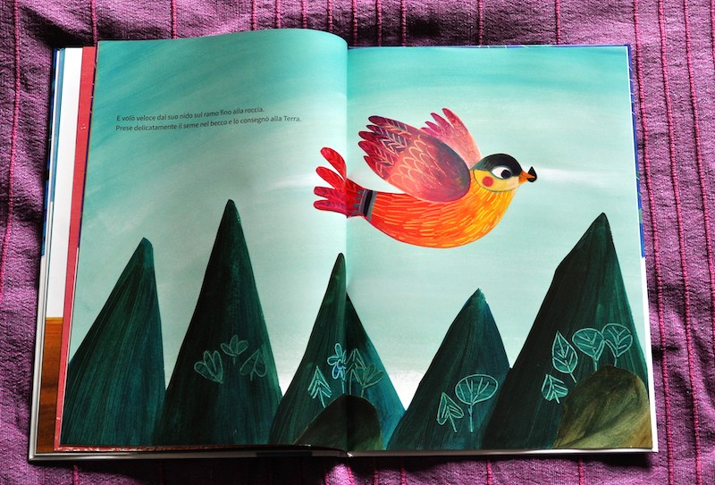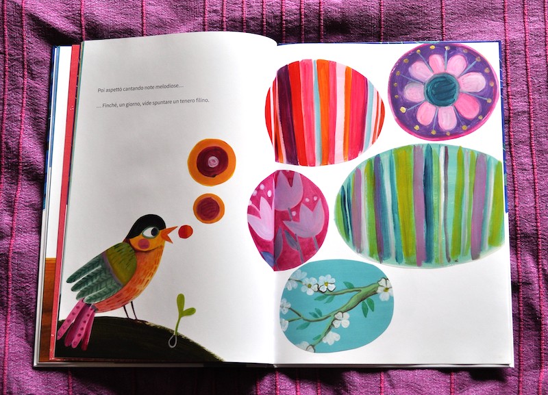 Proprio così vorrei concludere: parlando dei colori di questo meraviglioso albo. I colori e le forme con cui le illustrazioni di Nicoletta Bertelle accompagnano le parole preziose di Maria Loretta Giraldo, mi hanno incantata. Sono disegni dal gusto un po’ naïf, in cui il sole scalda il seme osservandolo con i suoi occhioni dalle ciglia fiammanti, la pioggia ha un volto di bimbo curioso, la terra si stende come una morbida coperta di patchwork, la bella e variopinta capinera accoglie il suo piccolo in un tramonto rosa. Tutto è coloratissimo, come a celebrare il potere della fantasia e la meraviglia della natura e della vita che non si ferma.