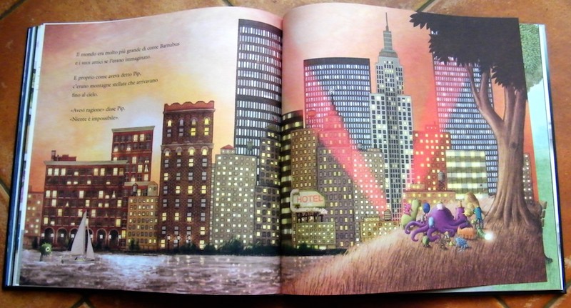 Quando cala la sera, gli animaletti contemplano per la prima volta le luci della città e uno splendido tramonto tinge le pagine di un caldo arancio.