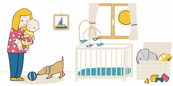 Poi l’occhio del bambino inquadra ciò che riesce a scorgere dalla culla: il piedino che esce dal pigiama a pois, le stelle della giostrina sopra il letto, il micio che passeggia sulla spalliera, l’orsetto di peluche che riposa lì accanto, e in ultimo la finestra, dalle cui tendine spunta uno spicchio di luna. Ancora una volta, l’immagine conclusiva riprende la stanza per intero, con tutti gli oggetti visibili nella loro esatta dimensione e collocazione.