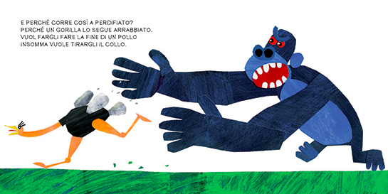 Il soggetto è spassoso, il testo è scritto in rima, le immagini sono il frutto di un vivacissimo mix di collage e colore tanto caro a Gek Tessaro. L’unica “pecca” dell’edizione precedente era il formato (piccino picciò) che davvero non rendeva giustizia alle illustrazioni e non dava abbastanza respiro al testo.