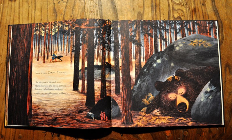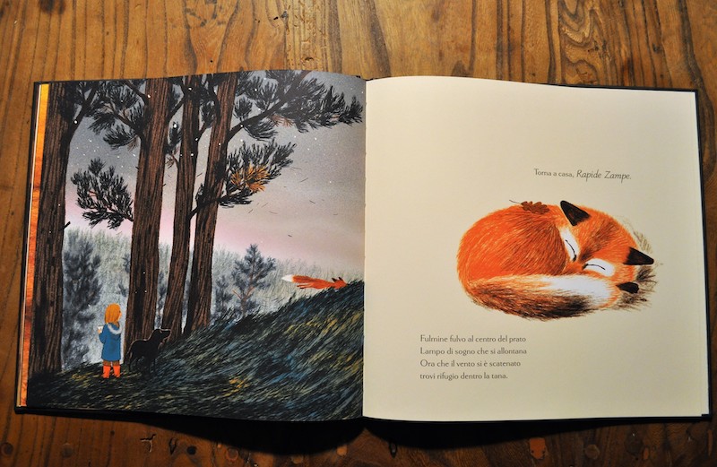 Tra gli alberi, vediamo o intravediamo l’orso, il cervo, il cerbiatto, la volpe, la lepre, un pesce, la tartaruga, il picchio, lo scoiattolo e il colibrì. L’autrice, Karen Jameson, sceglie per loro appellativi teneri e poetici, che Chiara Carminati traduce sapientemente, evocando rumori, odori, sapori, sensazioni. Tra gli altri, ci sono Ombra Enorme, l’orso, con la sua “placida pancia piena di more”, Rapide Zampe, la volpe, che corre a rifugiarsi nella sua tana, e Soffice Coda, lo scoiattolo, occupato a raccogliere le ultime ghiande. A tutti dedica parole attente, in rima, che evocano il calore di un abbraccio, raccomandazioni amorevoli che riconoscono ed evidenziano le loro doti più preziose, le loro fatiche, la laboriosità della vita nel bosco.