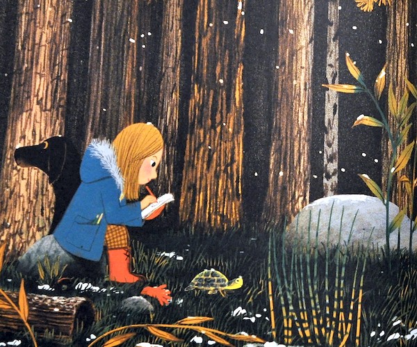 La calma e la pace che permeano l’intero albo, lo rendono, a mio parere, una delle più belle descrizioni dell’atmosfera autunnale, stagione che io personalmente amo più di tutte, ma anche un delizioso benvenuto all’inverno. I bruni e gli arancioni dei manti degli animali, delle piante e della terra si alternano con i verdi a tratti brillanti, altre volte più scuri, degli abeti e dell’erba che ancora non si è seccata. Per alcune delle bestiole che la bambina e il suo cane hanno visto nel bosco è giunta l’ora di ritirarsi in un sonno che durerà ben più a lungo e di assaporare la meritata quiete dopo mesi di intensa attività. Si stanno preparando al letargo, per affrontare l’inverno al caldo e al sicuro e risvegliarsi al tepore del primo sole primaverile.