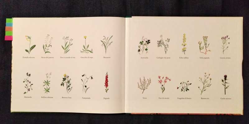 Ogni pagina scritta è corredata da delicate illustrazioni di fiori, la cui legenda si ritrova nei risguardi con i nomi per soddisfare le curiosità di tutti e le carte di guardia si trasformano in un atlante botanico, ma anche indice del libro.