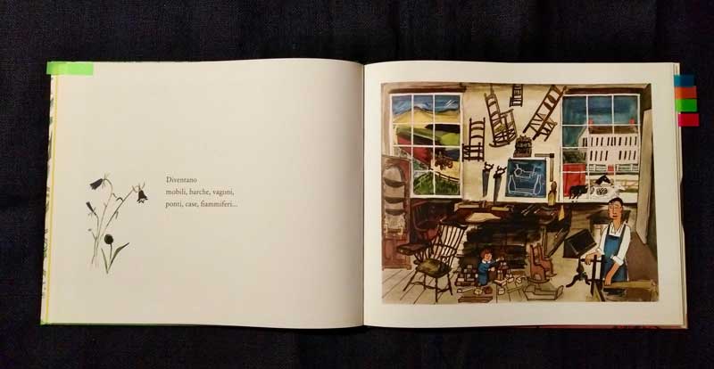 Il testo è breve e brevi sono i passaggi in ogni pagina, affiancata da un’illustrazione ampia e narrativa, che è di per sé racconto. Il ritmo lento genera un senso di pace.