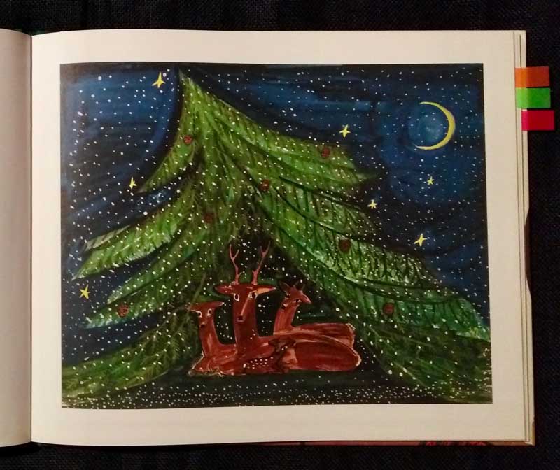 Le illustrazioni, realizzate a gouaches, sono frutto di una varietà di stili, si alternano colori caldi a colori freddi, immagini dense e delicati elementi decorativi.