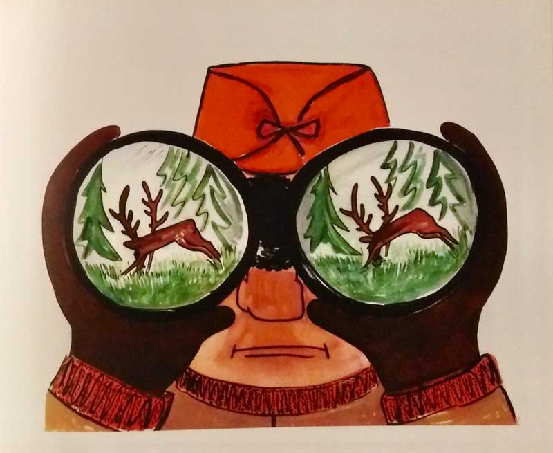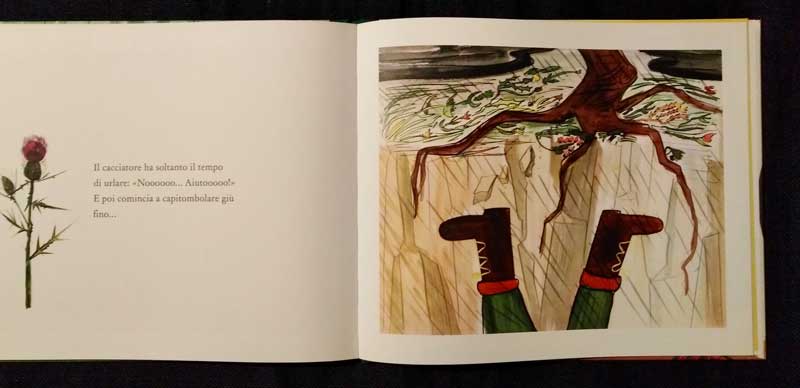 Morte e cacciatori, che oggi si tende spesso a epurare o tematizzare, sono topoi delle fiabe, elementi con i quali i bambini devono confrontarsi con naturalezza, sembra ricordarci l’autore, aggiungendo un tocco di umorismo nella scena della caduta, che ricorda quella dei cartoni animati. Certamente non ci piacciono i cacciatori nella vita, ma nelle storie possono avere un ruolo determinante.