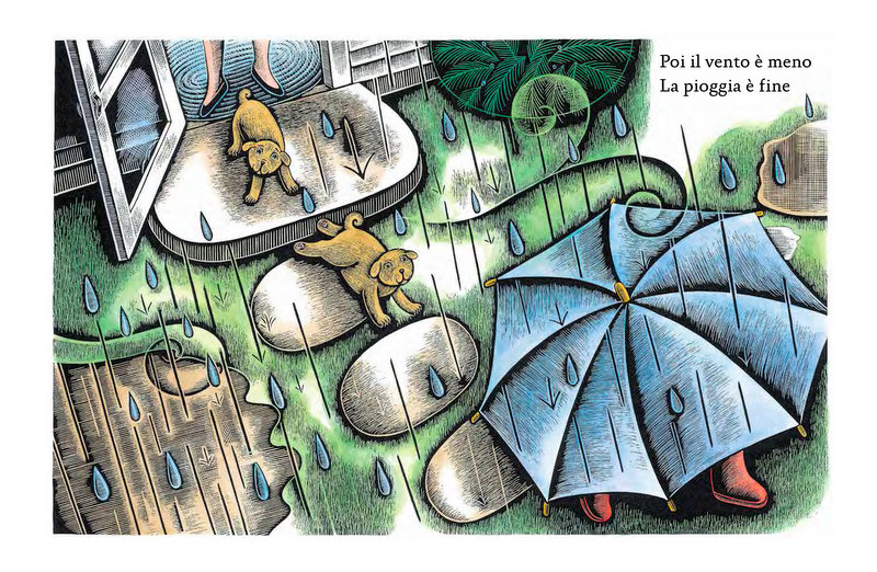 Ma poi ecco un altro cambiamento. Così com’era arrivato, il temporale inizia a diminuire di intensità. Il vento si fa più fine, le gocce d’acqua più rade. Piano… Meno… Meno… Fine! Ancora giochi di parole, ripetizioni, cambi di ritmo, assonanze. Leggere ad alta voce questo testo è un piacere assoluto. Solo un poeta e scrittore del calibro di Tognolini poteva riuscire nell’arduo compito di non intaccare il perfetto equilibrio tra testo e immagini dell’edizione inglese.