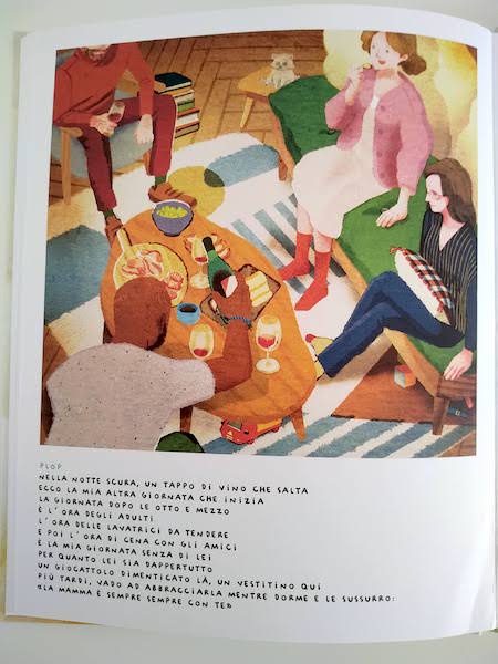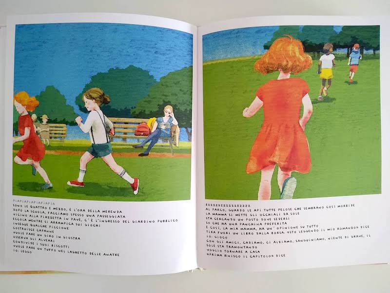 Per quanto concerne i testi, iniziano sempre con delle onomatopee; i rumori colti ora dall’una, ora dall’altra protagonista fanno da innesco ai loro pensieri. Sulla pagina di sinistra c’è sempre la madre: