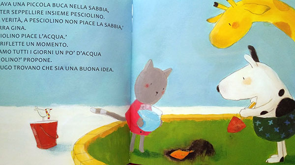 Un pesciolino amato che se ne va (o un cane, un gatto…) è un episodio molto frequente nella vita dei bambini. Una circostanza in cui ci si può riconoscere e che suscita empatia. Quando la giraffa Carlo propone di seppellire pesciolino in un bel giardino, Gina la trova una buona idea: potrà annaffiare il terreno, prendersi cura di lui, trasformarlo in un luogo speciale dove il ricordo del suo amico rimarrà vivo. E’ la stessa soluzione che spesso propongono mamma e papà quando l’animaletto di casa si spegne e, insieme, si decide di scavare una buca per lui in un posto significativo. Si decide di dedicarsi e pensare ancora a lui, anche quando non c’è più.