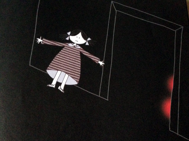 Alle argomentazioni che la bambina pronuncia con fierezza per superare la paura (non sono una fifona, sono grande e vado a scuola) si contrappone la sua immagine ritratta ora con le gambe tremanti, ora accovacciata dietro una pianta, sotto al tavolo, infine a carponi in mezzo al nero più nero che avanza indugiando verso una lucina chiara.