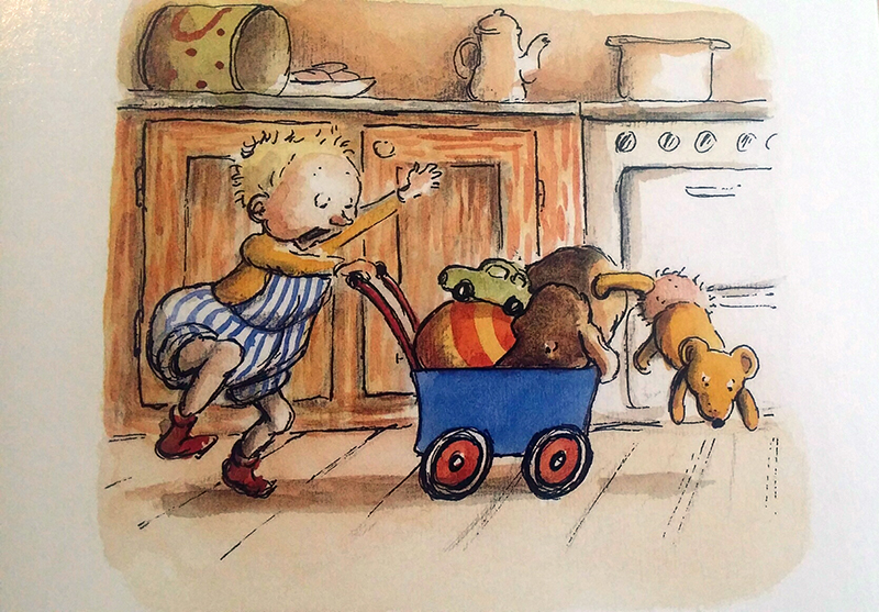 Anche quando spinge il carretto azzurro Max ha lo sguardo assorto di chi sta svolgendo un compito importante. I suoi compagni di giochi sono sempre con lui (il cane, l’orsetto di peluche, la palla, l’immancabile biscotto…). Uno dopo l’altro, volenti o nolenti, salgono a bordo e lo spostamento si fa più pesante e barcollante. Ogni tanto qualcuno cade, il viaggio si interrompe, Max lo recupera, il viaggio riprende, dal salotto alla cucina, dall’ingresso al giardino. Quanta strada sembrano fare e quanti sono gli imprevisti che li ostacolano. Ma Max non demorde, con la sua buffa tutina imbottita porta avanti seriamente la missione. E non importa se il biscotto sparisce un’altra volta e la guancia del cane golosone sembra stranamente più gonfia del solito. Anche questa è stata un’avventura divertente!