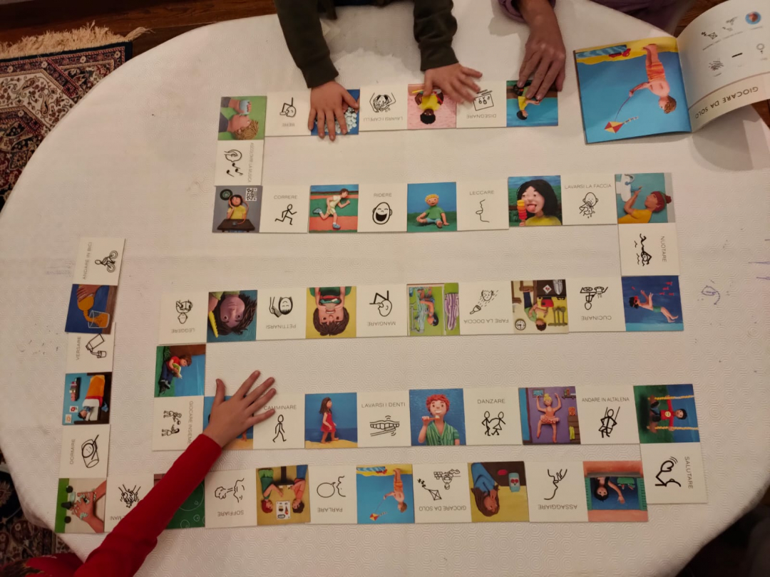 Un domino originale e invitante, dove le allettanti immagini sono accoppiate a semplici figure stilizzate e a frasi in cui i verbi sono stati scelti appositamente tra quelli usati tutti i giorni e tradotti anche in simboli PCS. L’idea è quella di facilitare la lettura, di incoraggiarne l’approccio rendendolo intuitivo e piacevole.