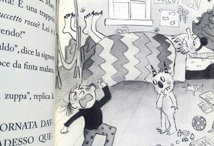Una sequenza di avventure reali e immaginate si succedono a ritmo vorticoso, condite di ironia, malintesi, accadimenti imprevisti, messe sulla pagina dalla bravissima Abby Hanlon con disegni in bianco e nero dal tratto semplice e personaggi dalla mimica e le espressioni accentuate (irresistibili gli sguardi di traverso della fatina dei denti, le smorfie di Dory, le occhiatacce della Arraffagracchi, la rassegnazione dipinta sul volto della mamma…).