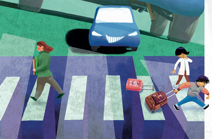 Se da un lato il registro testuale è molto pulito e lineare, e procede senza scossoni e senza quasi far riferimento esplicito alla separazione, nei disegni essa c’è, eccome, rappresentata in modo simbolico in tanti momenti: dall’entrata della scuola con i due alberi che si guardano con rabbia come se fossero la mamma e il papà in guerra, al ghigno minaccioso della macchina che sembra un mostro pronto a colpire il trolley di Giulia, danneggiandolo e rivelando a tutti il suo contenuto, all’uomo della merceria che ripara il trolley e assume le sembianze di un mago, o meglio di un re magio, levitando da terra e indicando ai ragazzi la via da seguire.