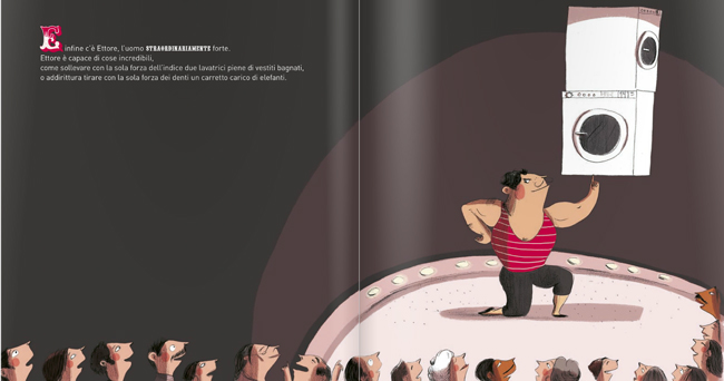Scegliere due lavatrici e un carrello della spesa come simboli della forza di questo circense, che è abbigliato con una canotta a strisce fucsia, è non solo azzeccato ma anche anticipatore di quello che poi il piccolo lettore – perché, sì, questo è un libro soprattutto, ma non solo, da proporre ai bimbi maschi – scoprirà essere il segreto di Ettore.