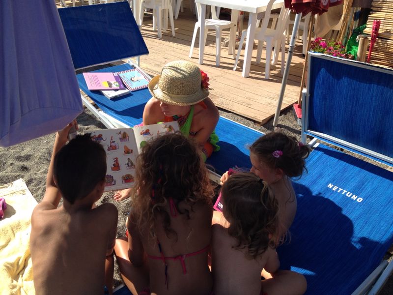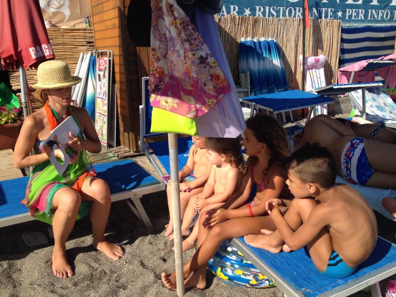 Ieri, dopo due giornate di fulmini e pioggia scrosciante, sono riuscita a organizzare il mio #flashbook2014 al mare, anche se la spiaggia era semi deserta e i bambini che sono riuscita a recuperare, pochi. Alla fine erano quattro: dai 2 ai 7 anni e mezzo. Gruppo piccolo (ottimo per farsi seguire), ma molto disomogeneo (rischiosissimo!).