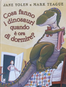 La terza lettura ad alta voce era dedicata principalmente a Samuel (il moretto nella foto sotto): se la meritava tutta: “Cosa fanno i dinosauri quando è ora di dormire?” di Jane Yolen e Mark Teague (Il Castoro).