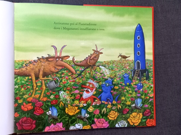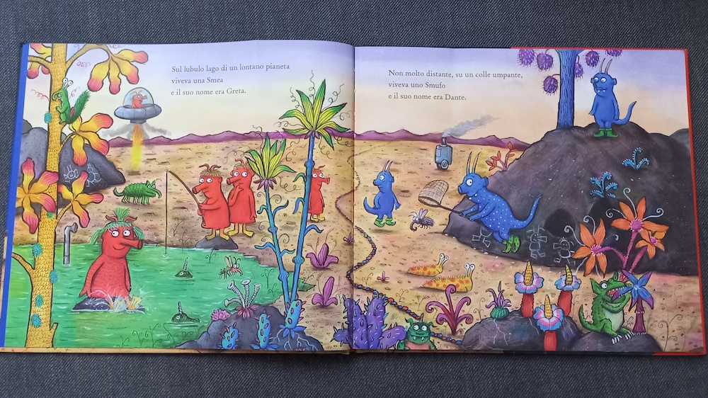 I famosi autori del Gruffalò tornano a unire rime divertenti e disegni prorompenti in una storia che parla di multiculturalità e integrazione. Julia Donaldson e Axel Scheffler stupiscono i lettori a ogni pagina, attirando fortemente l’attenzione attraverso colori accesi e parole-calamita. Così, in questo albo, la “luna” diventa “lumpa”, i “tronchi” diventano “trocli”, il lago è “lubulo” e il colle “umpante”, solo per fare alcuni esempi. Per non parlare del pianeta che fa ridere più di ogni altro e il cui nome difficilmente si dimentica… il pianeta di Puzzocacca!
