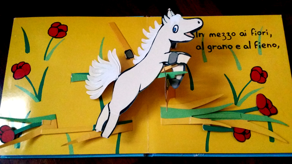I libri li conosce, li riconosce, li tira fuori dalla libreria con gusto, li sfoglia anche col ditino (qualche pagina per ora, senza seguire un ordine preciso) e poi li strapazza. Si diverte a toccare e indicare con l’indice soprattutto i pop-up, in cui le figure escono dalle pagine come elaborate sculture di carta. Mentre “legge” questi delicati libri, tutti i suoi sensi sono in allerta, e io gli sono accanto, lo assecondo, recito le brevi frasi di accompagnamento, ma sono soprattutto pronta a intervenire per evitare che il suo “entusiasmo” lo porti a danneggiarli irreparabilmente.