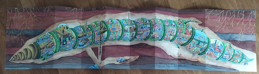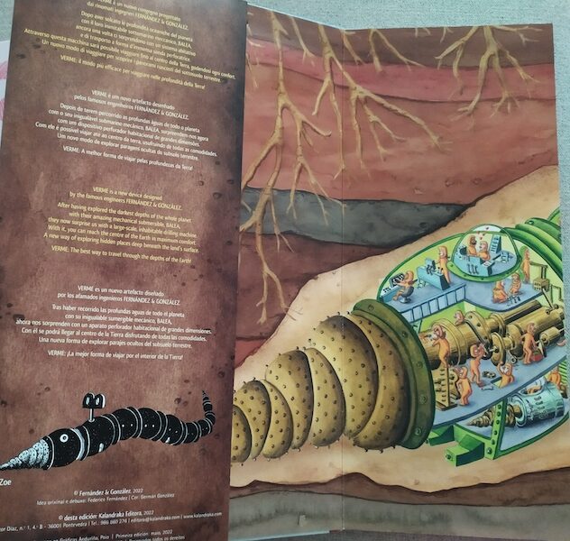 Le pagine si aprono a fisarmonica formando una sorta di poster leggibile davanti e dietro, come se fossero due sole grandi pagine. È un albo senza parole, l’unico testo è uno slogan da fascetta con punto esclamativo, quasi un Accorrete, accorrete! È scritto in diverse lingue (italiano, portoghese, inglese, spagnolo) sulla pagina che può essere considerata la seconda di copertina ma anche, come dicevo, una fascetta o una sovraccoperta. Infatti, la copertina, con sfondo marrone e con la scritta Verme in verde in verticale (lettere tenute insieme da viti e chiodi, montate a fatica da due esserini con chiavi inglesi grandi quanto loro stessi), si sfila dalla pagina rigida per scoprire dettagli della grande illustrazione.