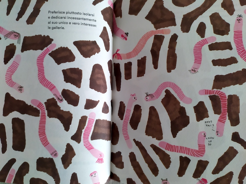 Alcune pagine sono dedicate esclusivamente alle gallerie, principale lavoro dei lombrichi, forse potremmo azzardarci a dire ossessione. Hanno le più svariate forme e viste su pagina doppia, come se fosse una sezione del terreno o una mappa dall’alto tolta la superficie, sembrano belle decorazioni di una carta regalo. E in effetti è proprio un regalo quello che fa il lombrico: areare la terra, mangiare gli scarti per renderli concime.