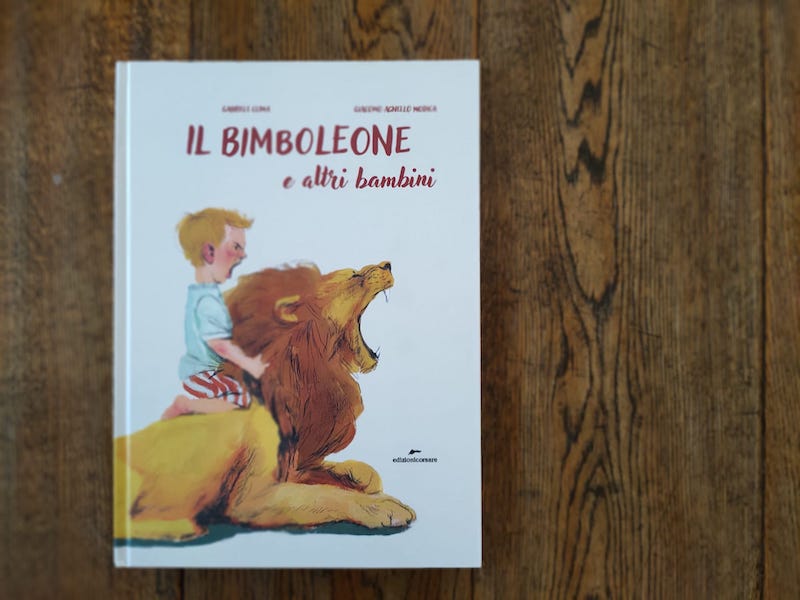 È un volume di grande formato. Le pagine bianche fanno da sfondo e danno ben risalto a testo e immagini. In copertina, naturalmente, c’è il BIMBOLEONE: un leone accucciato a terra con in groppa un bambino che sembra tenerlo per la criniera, pronto all’avventura. Entrambi sembrano ruggire, fieri, decisi. Arrabbiati? Forse no…