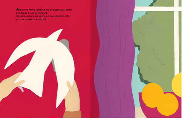 Il libro racconta, con un testo asciutto e centrato, i primissimi esperimenti fatti con forbici e carta da parte del maestro. Un giorno, quasi per gioco, ritagliò un uccellino da un pezzo di carta bianca e lo attaccò a una parete del suo appartamento per nascondere una macchia. Ma l’uccellino gli sembrò solo, così ritagliò altre forme che via via aggiunse sul muro.