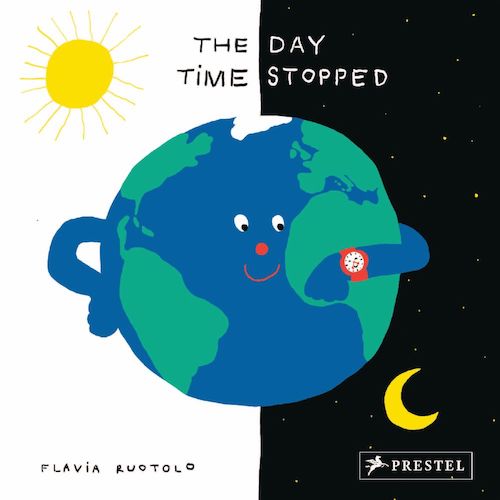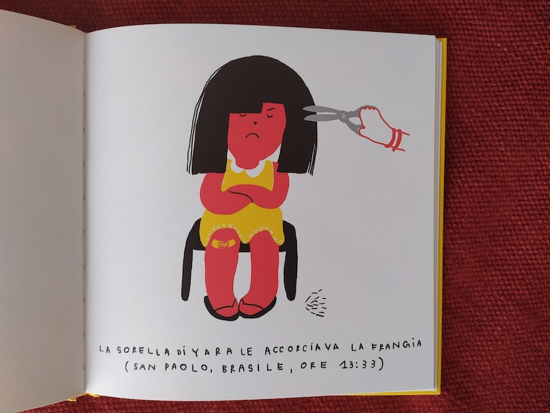 Sono rossi i capelli della protagonista, una bambina dall’aria decisa, i pantaloni a pois, gli stivali e la maglia gialli. L’ho chiamata protagonista, ma in realtà il vero protagonista è il tempo, o il mondo, o tutti gli altri personaggi che incontriamo nel libro. Perché Il giorno in cui il tempo si è fermato racconta un giro del pianeta in un solo minuto! È un viaggio di 40 pagine, somiglia anche a una carrellata di diapositive.
