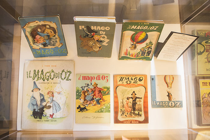 The Wonderful Wizard of Oz di Frank Baum fu pubblicato a Chicago nel 1900. Negli Stati Uniti il successo del ciclo, che comprende ben 14 romanzi, fu subito travolgente, mentre in Italia si deve alla caparbia Maria Luisa Agosti Castellani, giovane e già nota traduttrice, l’arrivo della prima edizione nel 1944 edita dalla S.A.S. (Società Apostolato Stampa) ed illustrata dalla Ferro Pellizzari, Miki in arte, cui subito seguì la pubblicazione della Bibliotechina Oz, otto piccoli volumi della collana Amici di Dorothy.