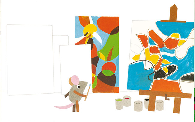 Ho trovato particolarmente significativa la metamorfosi che interessa la soffitta che, nell’incipit del libro, è abitata da una bambola di pezza, una lampada rotta, della carta di giornale stropicciata e tele di ragno. Dopo la visita di Matteo al Museo d’Arte, quando il topino si sveglia dal sogno nel quale incontra Nicoletta ed, insieme, camminano nella grande tela colorata, quella stessa soffitta viene disegnata da Lionni in maniera differente. La bambola di pezza, la carta di giornale, la lampada e le tele di ragno si trasformano in macchie geometriche colorate e tutto appare mutato.