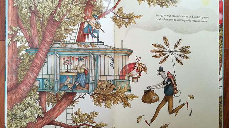 Le illustrazioni di grande maestria, dal tratto romantico e fiabesco, catapultano il lettore in un mondo arcadico dove i bambini giocano immersi nella natura e la vita scorre ad un ritmo lento e profondo. I colori sono quelli tipici dell’autunno, con tonalità calde e raffinate. Le architetture presentano uno stile che guarda nostalgico al passato e sono ricche di dettagli e sciccherie nelle quali l’occhio si perde incuriosito. Un incanto.