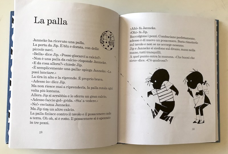 Ciascun episodio è un breve racconto indipendente, accompagnato da qualche illustrazione. Sin dal loro primo incontro, Jip e Janneke diventano inseparabili e il lettore distratto potrebbe scambiarli per due fratellini piuttosto che due vicini di casa. Sono spesso l’uno a casa dell’altra, oppure insieme, da qualche parte, a giocare. Si cercano, si fanno compagnia quando sono malati, litigano facilmente e se ne dimenticano con altrettanta facilità. Non fanno nulla di sensazionale, al contrario tutto si compie nella normalità finanche banale quale può essere la vita di un bambino piccolo. Ma con il loro sguardo e sulla loro pelle, questa normalità risulta estremamente eccitante e piena di sorprese; la forza immaginifica della loro infanzia trasforma ogni cosa e la anima e i piccoli lettori si trovano riconosciuti e confermati in quello che è anche il loro modo di stare al mondo.