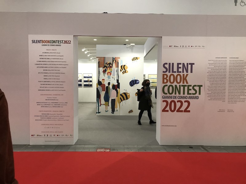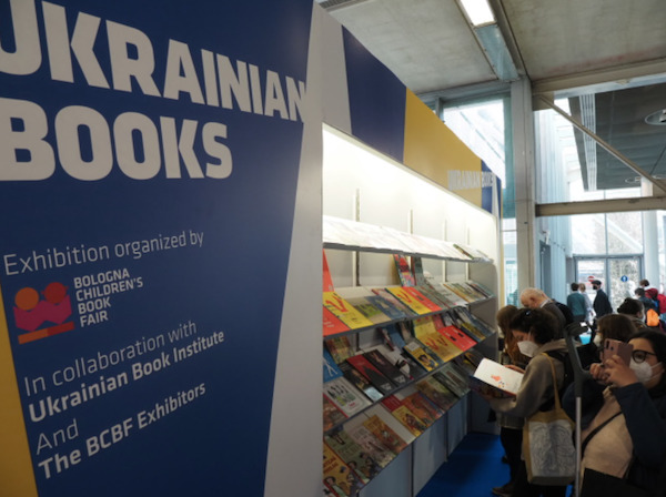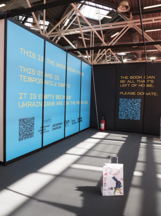 Non mi resta più moltissimo tempo per visitare il padiglione con gli espositori internazionali; seppure nella rapida vasca che mi concedo, mi sembra che qui il movimento di pubblico sia assai contenuto. Impossibile non sentire due grandi assenze, non già perché abbia idea di come fossero i loro stand nelle passate edizioni, ma semplicemente per il peso della cronaca: sto parlando, evidentemente, di Ucraina e Russia. Non mi soffermo sulla messa al bando delle rappresentanze russe da parte della direzione della Fiera, atto che comunque suscita perplessità. Resterà sicuramente nella memoria di chi ha partecipato a questa edizione il toccante stand vuoto dell’Ucraina: this stand is temporarily empty. It is empty because the ukrainians are on the frontline. Eppure l’Ucraina è paradossalmente molto presente: c’è infatti l’Ukrainian Books, un’esposizione di libri di autori ucraini selezionati nelle passate edizioni, tra cui è esposto anche The War: The Children Who Will Never Get To Read Books, testo di Masha Serdiuk e illustrazioni Tetyana Kalyuzhna, l’instant book, realizzato nell’attuale Kiev sotto assedio, poi inviato digitalmente e stampato in una singola copia visionabile qui.