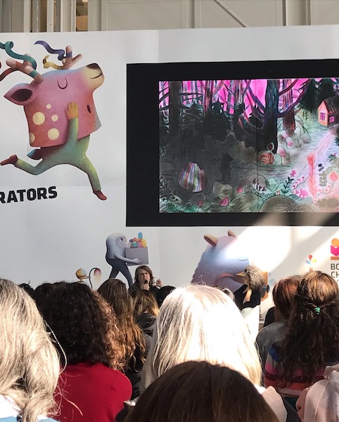 Innanzitutto mi pare imperdibile la rara opportunità di ascoltare Kitty Crowther, intervistata da Ilaria Tontardini nello spazio del Caffè degli Illustratori, proprio all’ingresso della fiera; è dunque lei ad inaugurare la mia visita. L’occasione di questo dialogo è data dall’apertura di una mostra personale della Crowther presso lo spazio dell’Associazione Hamelin di Bologna in calendario la sera stessa, L’ora magica BOOM 2022 – Kitty Crowther – Hamelin.