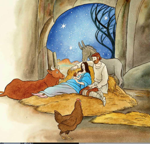Sotto un cielo pieno di stelle i due avvistarono una grotta e si avvicinarono. Giuseppe fece un lettuccio con la paglia. Maria si distese.