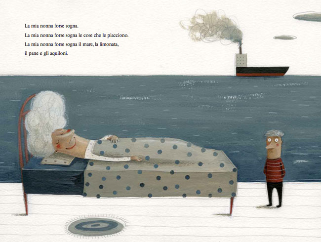 Ma la morte è stata per la nonna anche una liberazione. Il bambino sa che adesso lei non si limita a sognare… La finestra della sua camera è aperta, lei è uscita e sta facendo tutto quello che le piace: vola con gli aquiloni, beve limonata, nuota nel profondo del mare, prepara tonnellate di pane.