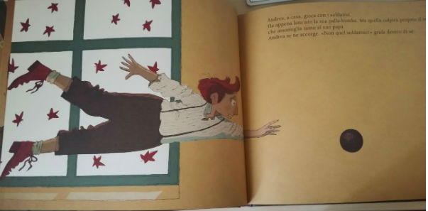 Anche Andrea è solo, a casa, e sta per abbattere l’ultimo soldatino, quello che assomiglia tanto al suo papà… Ma con un tuffo disperato riesce ad afferrarlo prima che la palla-bomba lo colpisca. Il soldatino torna al sicuro nella sua trincea.