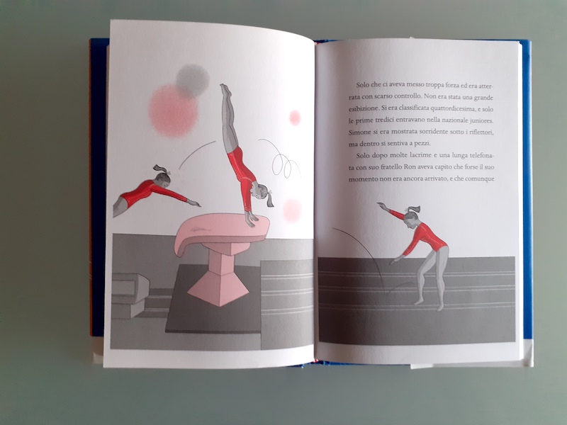 Ad accompagnare la storia ci sono le illustrazioni di Elisa Macellari, che compaiono nei momenti salienti del racconto. Immagini pulite, immediate, che si colorano di piccole pennellate di colore rosso: rosso fuoco, rosso passione, rosso determinazione come Simone Biles e la sua vita dedicata alla ginnastica.