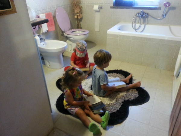 La scena è stata comica: inizia il biondino: “Tappeto, sul tappeto!”, corre a prendere un libro accatastato sul comodino della zia in camera e si scaraventa sul pavimento del bagno. Lo segue come una furia la pupa col cappello. Altra corsa, altro libro, altro stop accanto al bidet. Infine la boccolosa in prima fila: “Arrivooo!”, afferra alla cieca un terzo libro e plana sul tappeto fiorato per “leggere” comodamente insieme agli altri.