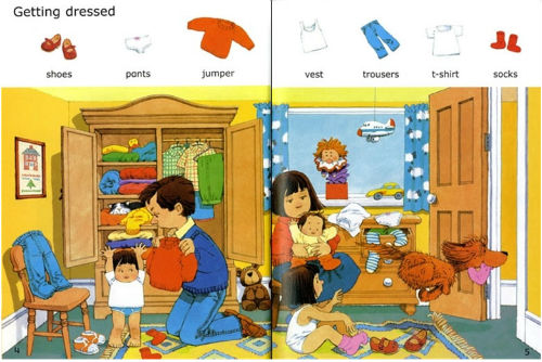 Uno dei più conosciuti è “First Hundred Words in English”, scritto da Heather Amery e illustrato da Stephen Cartwright, pubblicato dalla Usborne. Si tratta di un libro di poche pagine e di dimensioni considerevoli, che presenta alcune tipiche ambientazioni con un buon numero di immagini esplicative.