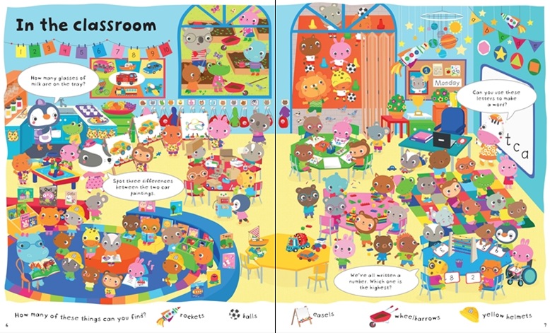 Si può passare in seguito a un libro più interattivo, Lots of Things to Spot at School, sempre della Usborne. Ogni doppia pagina presenta un’ambientazione di tipo scolastico: al lettore viene chiesto di individuare oggetti, personaggi, azioni. Per esempio: “Can you see someone running for the bus?”, oppure “ How many of these things can you find?”.