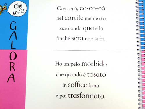 In ciascuna di esse le fotografie – si tratta di foto decontestualizzate con l’animale in primo piano – sono contrassegnate dai termini corrispondenti e, in ogni pagina, c’è una domanda su un animale da individuare: “se mi accarezzi faccio le fusa… chi sono?”, “porto la mia casa sulle spalle… chi sono?”, “il mio naso si chiama proboscide… chi sono?”.