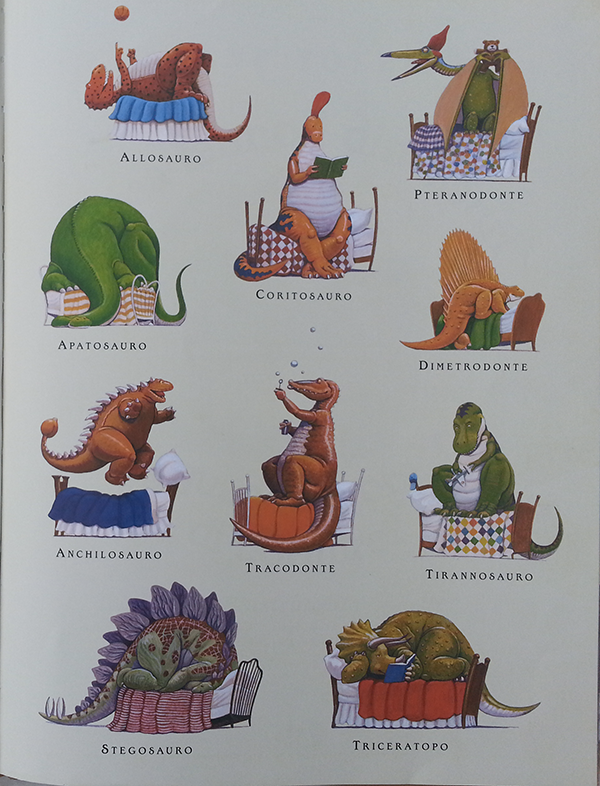 Qualche pagina dopo, è il turno della mamma, delle varie mamme che tentano di convincere i loro piccoli dinosauri ad andare a letto.
