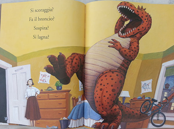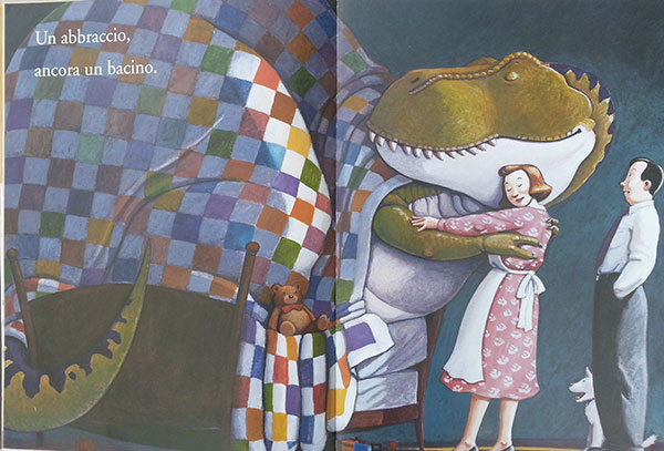 Testo in rima che fila veloce, illustrazioni formidabili che ci fanno entrare nella cameretta di un bambino qualsiasi (colorata, piena di giochi, libri…), ma a al posto del bambino vero e proprio c’è un tirannosauro che si intrattiene con un trenino. Eppure il suo papà è un umano… Ecco che si capisce il gioco e i piccoli ascoltatori ci stanno, si calano divertiti nell’atmosfera pazza del libro.