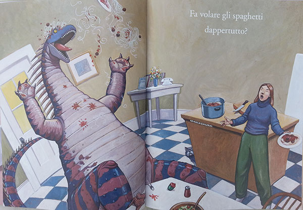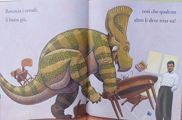La scena mostra un altro dinosauro (uno stegosauro) e un altro papà. Il lucertolone spazza per aria giochi e soprammobili con la coda mentre il padre lo guarda spazientito. Anche la stanza da letto è cambiata. E così via, si va avanti con un altro dinosauro ribelle che non vuole fare la nanna e un altro papà demoralizzato che si mette le mani fra i capelli mentre la nuova cameretta appare sempre più un campo di battaglia, un tripudio di vita e allegria, dove trovano il loro posto anche gatti, cani, orsetti, conigli, volpi, ranocchi.