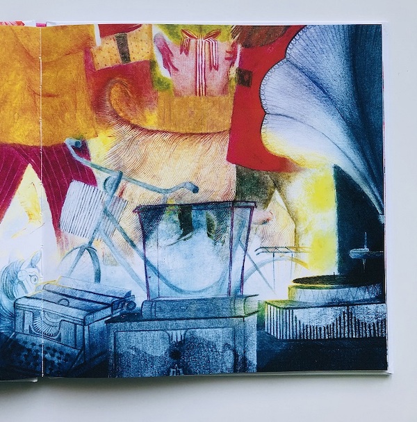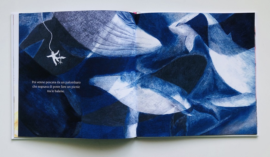 Tra pagine a fondo bianco coi disegni che scompaiono oltre i margini e altre totalmente illustrate, Isabella Grott alterna l’uso di acquerelli, pastelli e collage, per dare forma e vita ai personaggi e ai sogni narrati, muovendosi a metà tra il reale e l’onirico: persone dai tratti realistici si mescolano con scimmie ballerine, gatti in poltrona, balene ad un picnic, torri pendenti, piante giganti, teche da museo, cianfrusaglie e bauli. Questa è, a conti fatti, una storia potenzialmente senza fine, in grado di rinnovarsi di continuo, senza arrivare veramente mai ad una conclusione, così come lo spazio dei nostri desideri è, per definizione, sconfinato ed eternamente instabile.