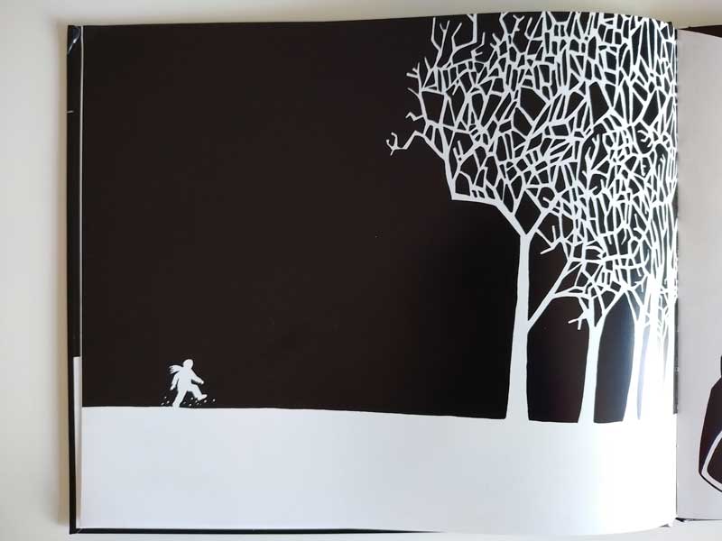 Mentre leggiamo, il bianco e il nero si alternano tra sfondi e silhouette, in un gioco non solo estetico ma anche di senso; tutta la storia infatti ricorre a questa mutevole polarità per comunicare sensazioni e contenuti. Il buio che sovrasta, circonda e insegue è “il lupo nero”, ciò che per antonomasia spaventa pur restando nell’ombra dell’ignoto, sfuggendo dunque alla visione del reale. È al bianco però che sarà data l’ultima parola, in un imprevedibile rovesciamento di eventi e prospettiva.