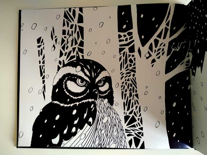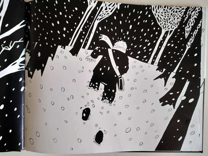 Siamo in inverno, verso sera, quando il buio è già profondo. Ha nevicato molto e il suolo è ricoperto da una coltre soffice e bianca. Un ragazzo cammina nella neve, sentiamo il rumore dei suoi passi, sentiamo il suo respiro uscirgli dalle labbra e lo vediamo immediatamente condensarsi nell’aria gelida. Appare tranquillo, nonostante il buio e la solitudine; forse è abituato a quel percorso che, immaginiamo, lo condurrà a casa. Tra il ragazzo e la sua destinazione, quale che sia, c’è un bosco; i rami degli alberi sono fittamente intrecciati e disegnano, proprio all’ingresso, una sorta di inquietante portale. Come se non bastasse questa immagine a suggerire il senso di pericolo al quale il ragazzo si espone varcando quella soglia, ecco ricomparire da dietro i rami i due occhi che abbiamo già incontrato in copertina. Un lupo nero è in agguato, segue di nascosto il ragazzo, i suoi passi felpati sono resi ancora più silenti dalla neve. Ci vorrà un po’ prima che il giovane si accorga di questa presenza alle sue spalle.