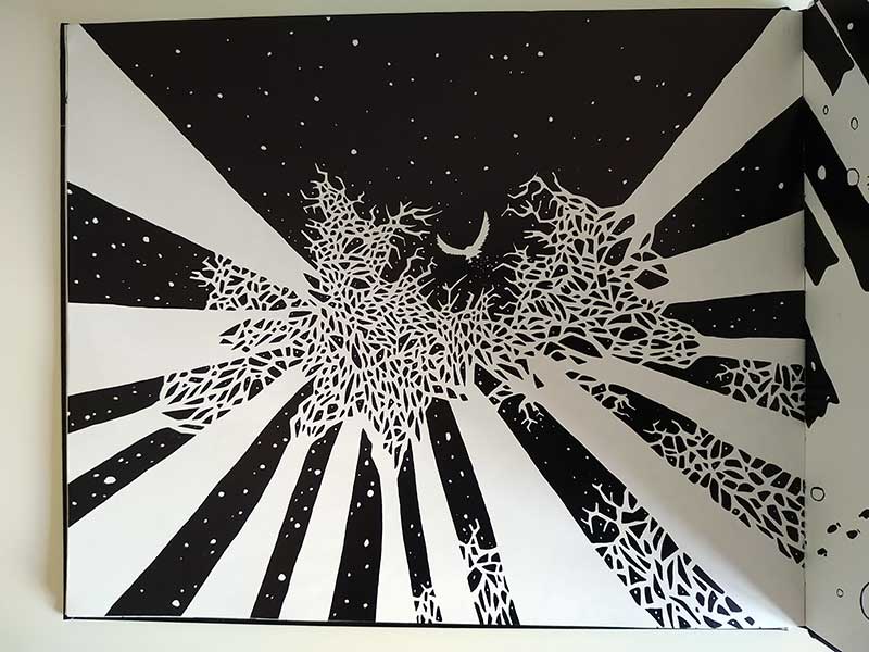L’altra caratteristica peculiare di questo albo è che le illustrazioni sono realizzate interamente in bianco e nero; la tecnica figurativa ricorda per effetto visivo quella dell’intaglio, usata da Guilloppè in altri suoi lavori; in realtà qui tutto è disegnato, c’è solo l’inchiostro, o la sua assenza. Niente sfumature, niente ombre, solo bianco ottico e nero di china. Se la copertina poteva suggerirlo, è nel risguardo iniziale che vediamo dichiarata questa scelta compositiva: il libro si apre in orizzontale e, per tutta la lunghezza della primissima apertura, lo spazio è tagliato nettamente in due, sopra il nero, ampio e totale, sotto il bianco, candido, intonso. Scopriamo ben presto che, oltre a fungere da dichiarazione programmatica, questa tavola ci introduce nell’ambientazione della storia, come sarà evidente poi nel risguardo finale.