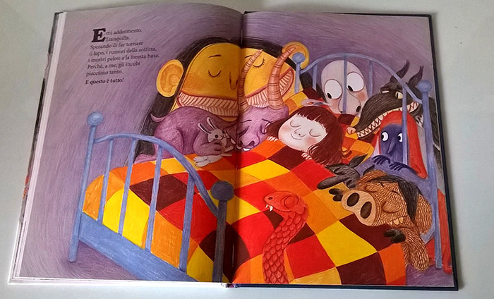 Così, uscita la mamma dalla cameretta, la piccola elimina peluche stucchevoli e libri luccicanti e si addormenta tranquilla nella speranza tornino a farle compagnia lupi, rumori, mostri pelosi e una foresta buia.
